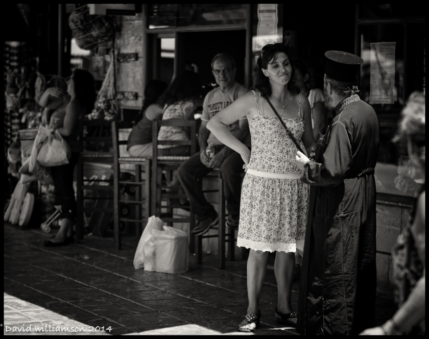 This shot is one of my very latest. People are what really fascinate me. I’m a lazy photographer and I just stand in one place while the family shops and wait for the world to pass by my lens. However owning a Leica will not turn you into Henri Cartier Bresson overnight, I’ve miles of film and hundreds of digital images to prove it. However if you work at it, occasionally some magic happens, like this shot. I love the body language, and the facial expression of this lady talking to the local priest. Taken in Chios ,Greece where I spent my summer holidays this year.