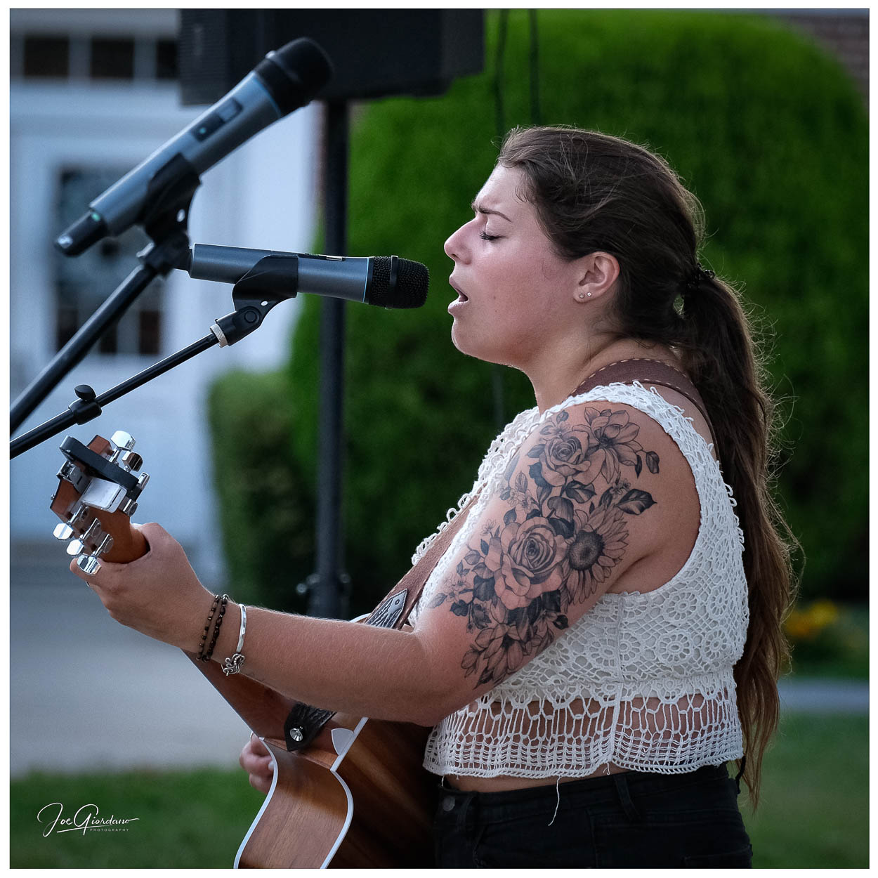 This image was taken as the evening sun was going down with a Fujifilm X-T4 camera and XF 70-300mm lens at ISO 2000. This talented young lady was a treat to listen to.