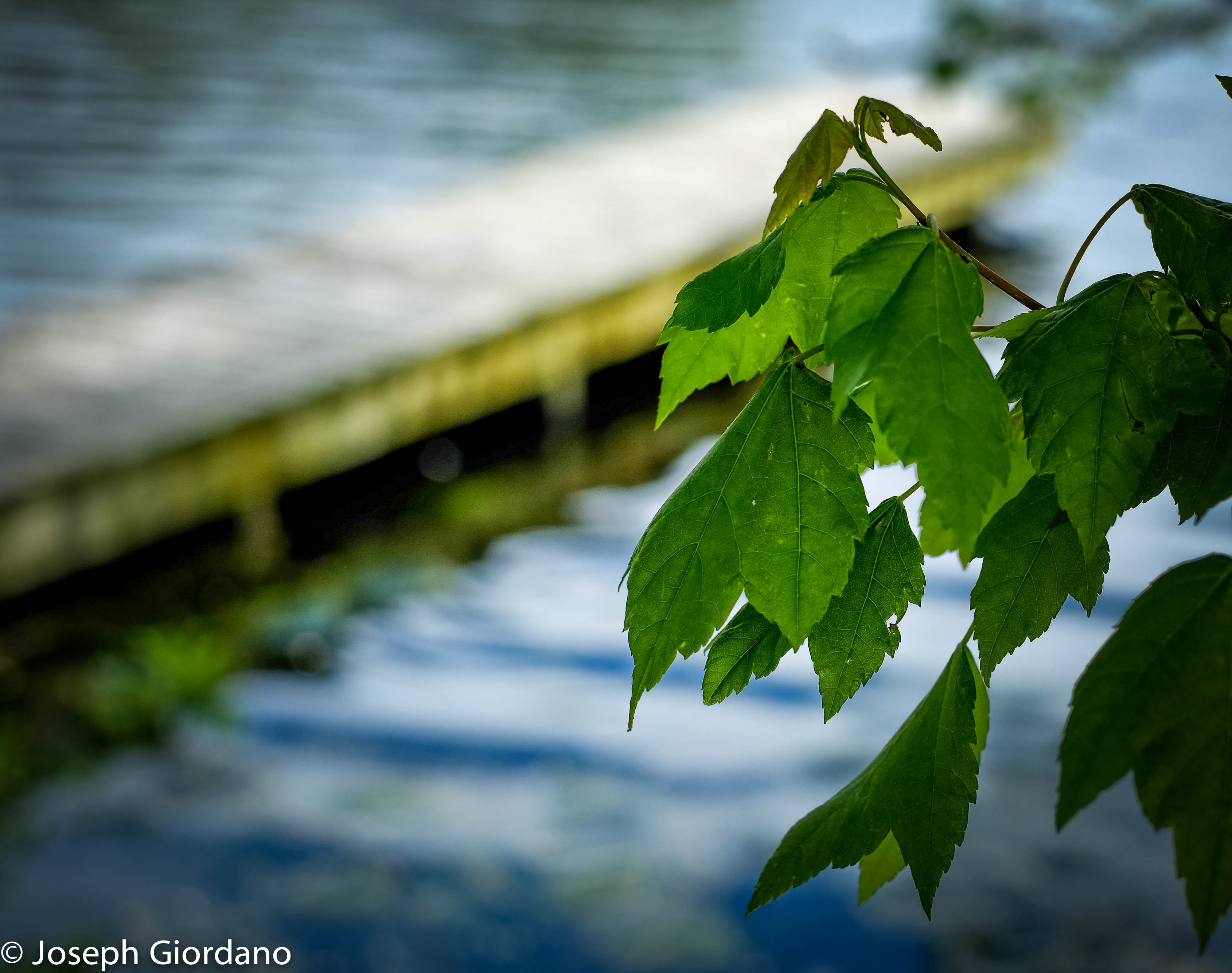 The sunlight was hitting these leaves just at the correct angle to give them a little translucence. I decided the leaves should be in focus and the small dock and the lake in the background should be left to the imagination. I hope you enjoy.